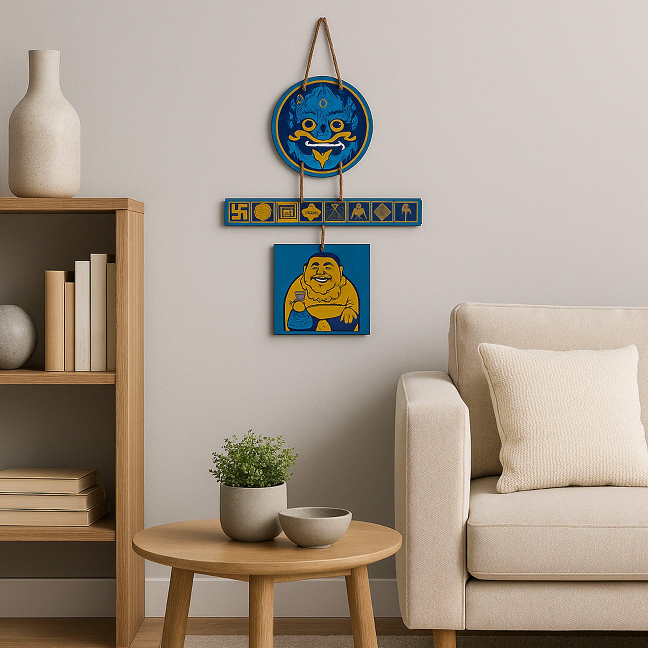 Crafted in tranquil blue tones, this wall hanging serves as a powerful Suraksha Kavach that guards your home or workplace from evil eye, black magic, and negative energies. A blend of ancient Vastu, Feng Shui, and protective symbols, it features the sacred Rahu face, Astamangal strip, and Laughing Buddha — together forming a shield of peace and divine protection. An essential for your entrance, living area, or temple, it ensures calmness and spiritual safety in every corner.