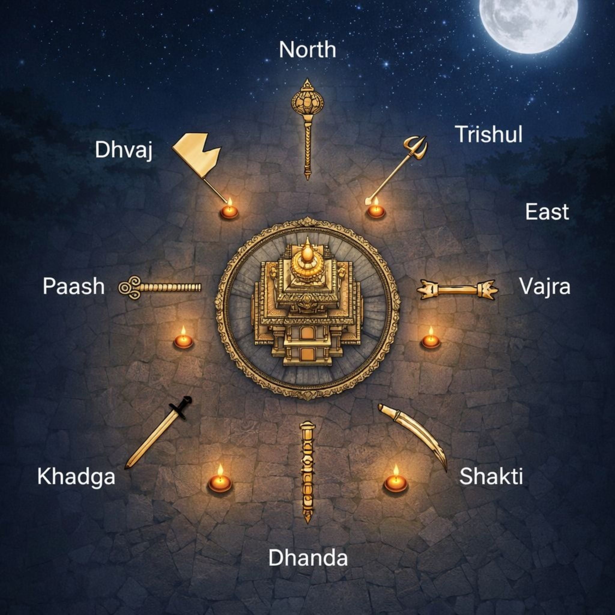 Invoke the guardians of the eight directions with this consecrated Vastu Digpal Yantra set, crafted in brass to establish protection, order, and directional harmony in your sacred space.