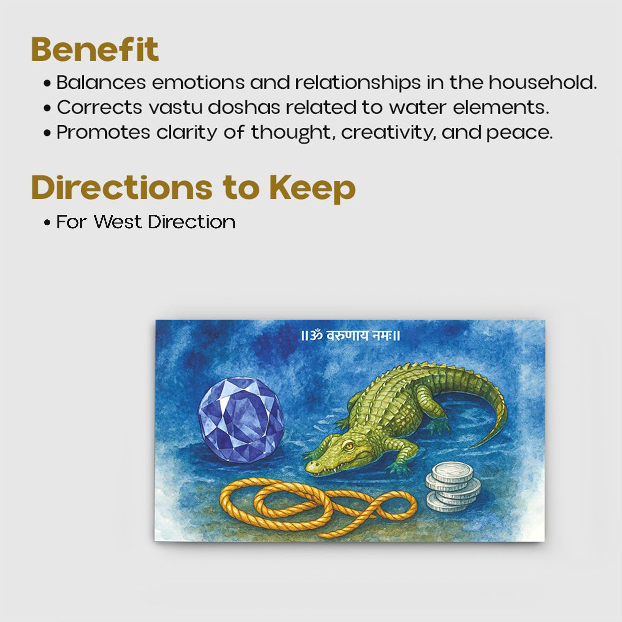 In Vastu Shastra, the West direction is governed by Digpal Lord Varun, while Planet Shani acts as the karmic administrator (Karka). This poster harmonizes both forces through sacred symbolism—the Crocodile (Vāhana of Lord Varun) and the Rope (Pāsha)—bringing control, protection, patience, and deserved outcomes into one’s life.