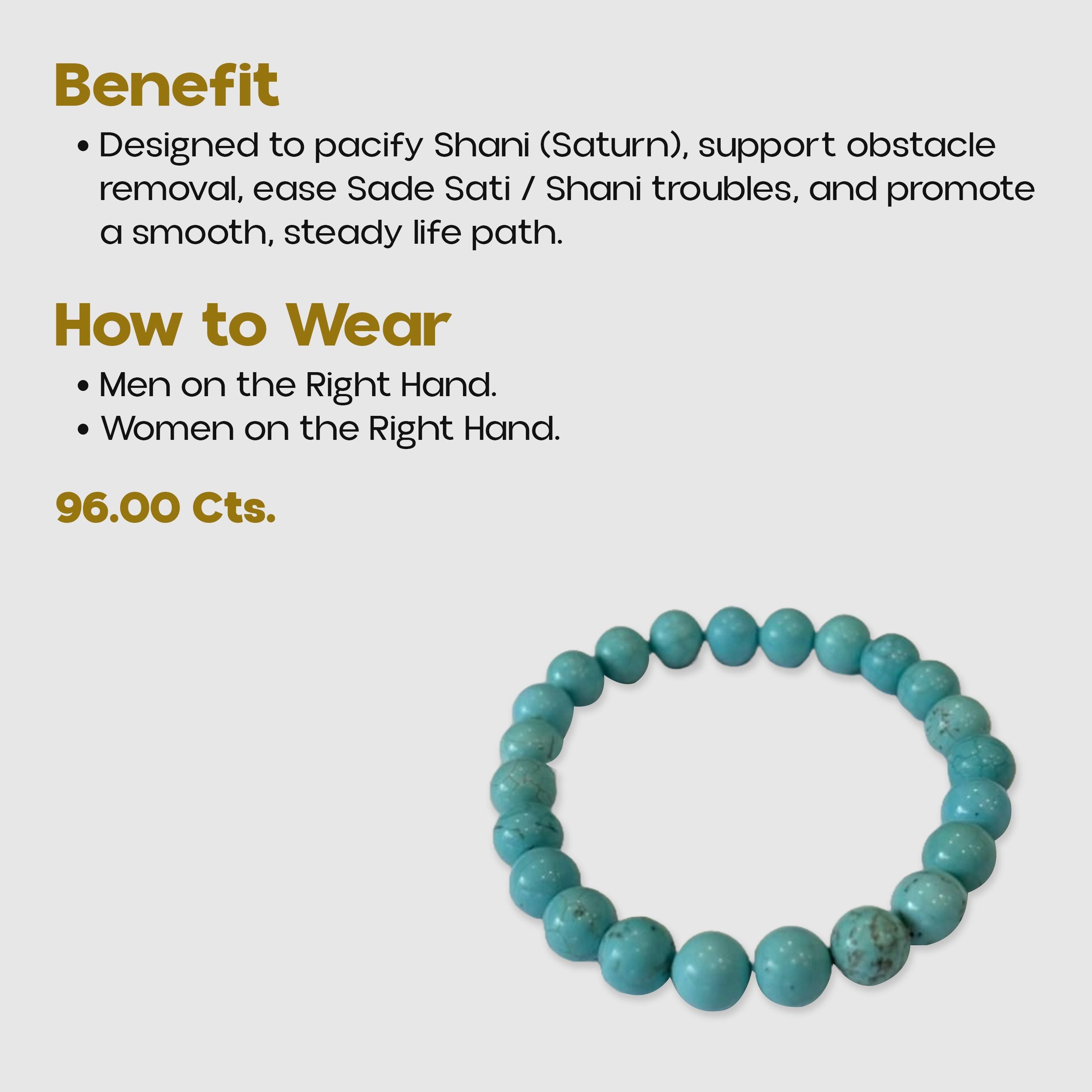 A protective turquiose bracelet designed to pacify Shani (Saturn), support obstacle removal, ease Sade Sati / Shani troubles, and promote a smooth, steady life path. Worn with intention, this bracelet encourages patience, stability, and calm decision-making, helping you navigate challenges with confidence and emotional balance.
